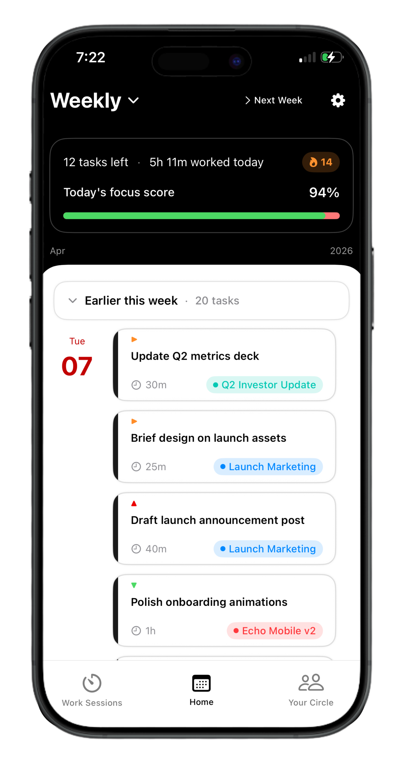 Tasks and your circle, side by side. Each tap syncs to your Mac the moment it lands.