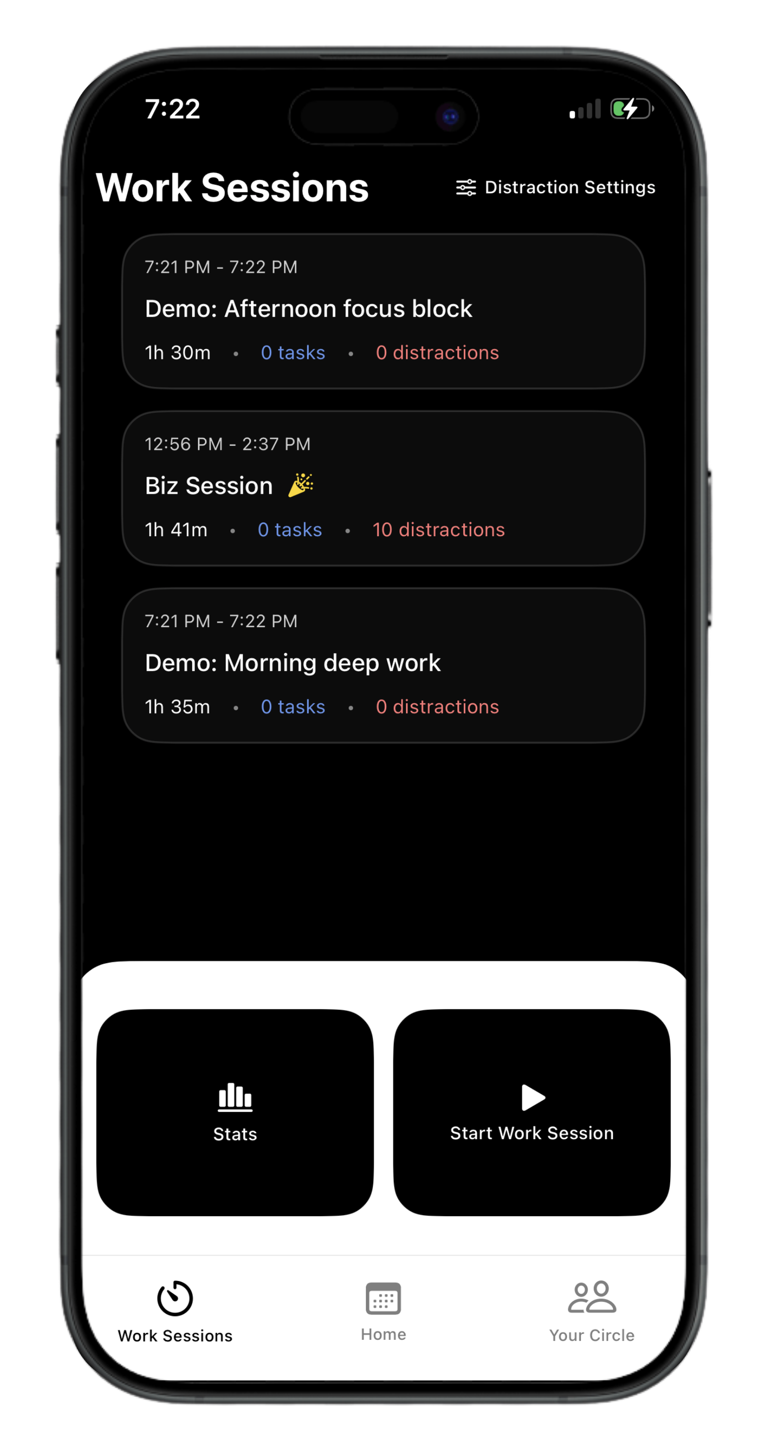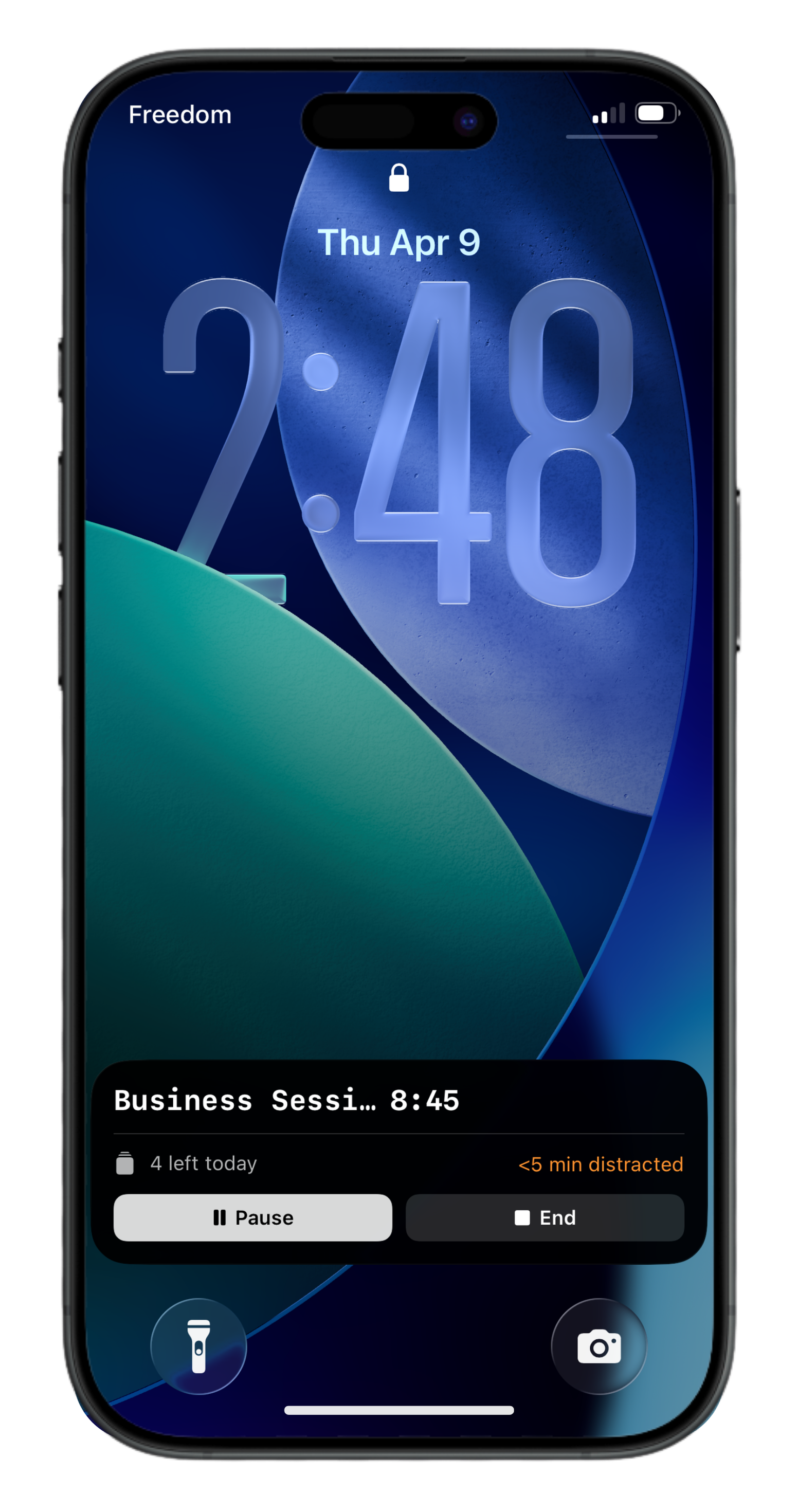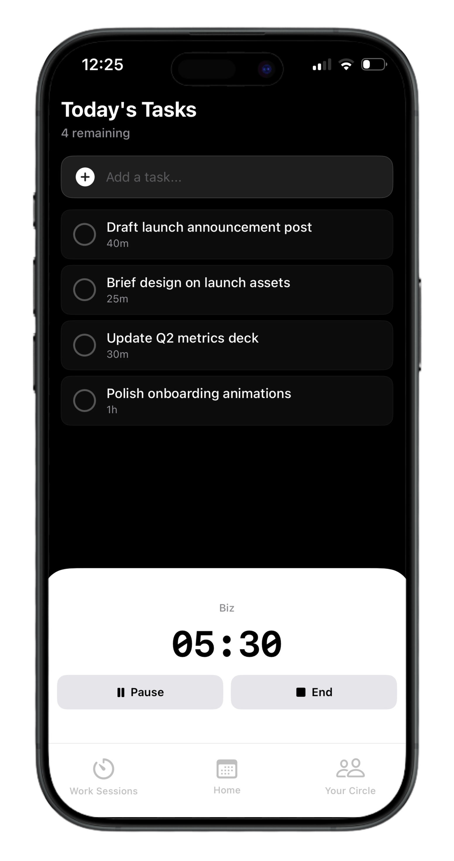 Session pill sits in your island the whole time you're working. One tap to check in, never a takeover.