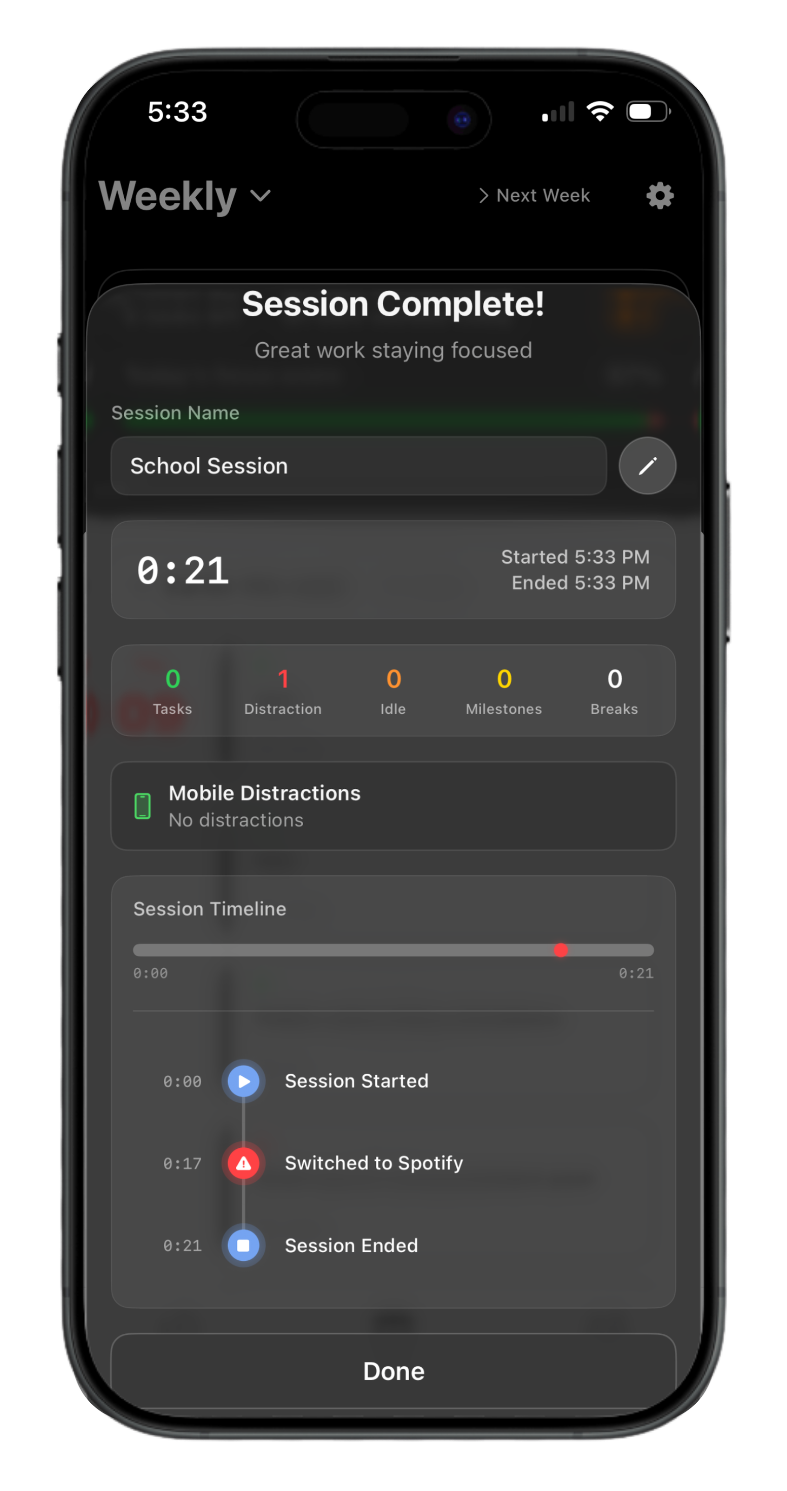 "Just one second" turns into nine minutes. Echo knows. Every distraction is timestamped, tied back to a session, and synced to your weekly review — so it isn't a vibe check, it's a receipt.